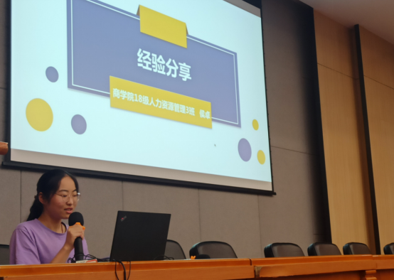 优秀学生代表侯卓分享学习经验,18级人力资源管理三班的侯卓同学从学习、人际、心态、未来四个方面进行了经验分享。她结合自己以及身边同学的真实情况进行分析,让在场同学感同身受,此次分享给大家提供了许多可以借鉴的经验,不只是有关学习,也是与大家校园生活紧密相关。
