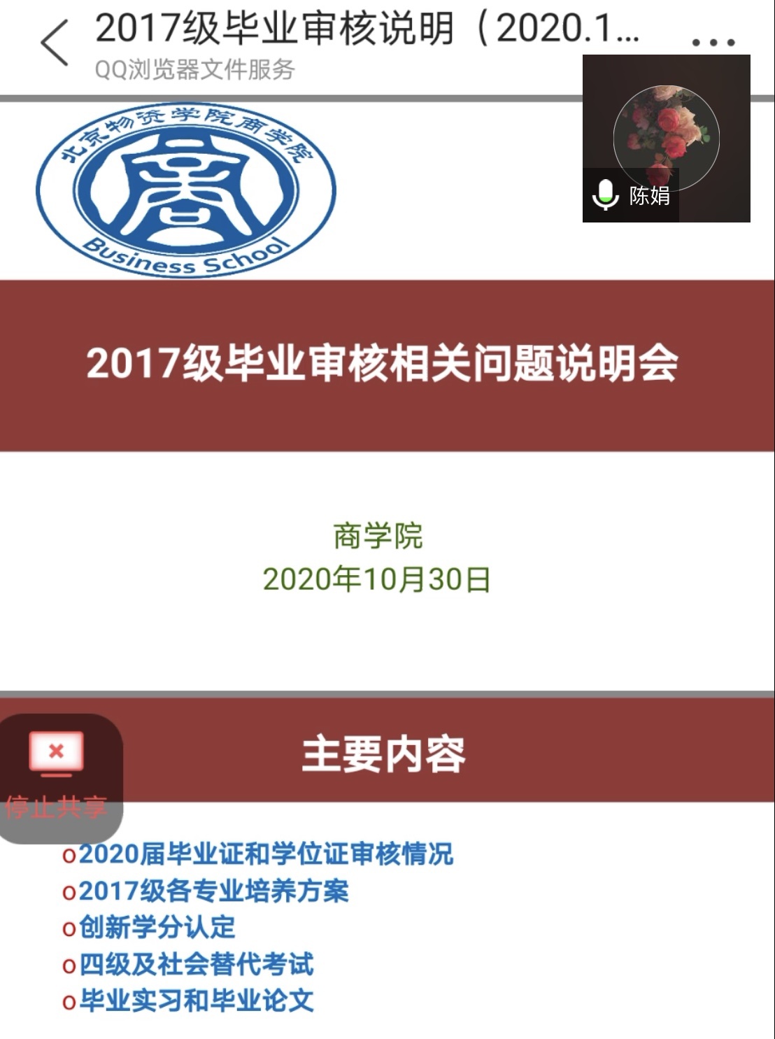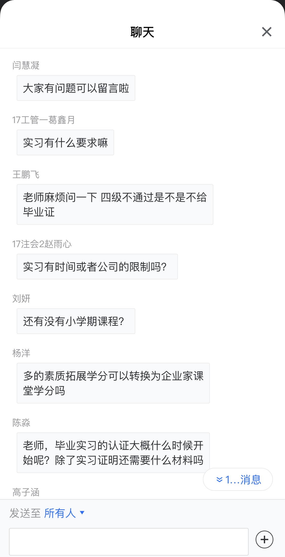 本次课程就毕业年级的相关问题进行了很有效的回答,两位老师不仅分享了自己的经验,也为同学们线上答疑,2017级的学生对毕业相关事宜有了全面了解,感谢两位老师的讲解、分享。