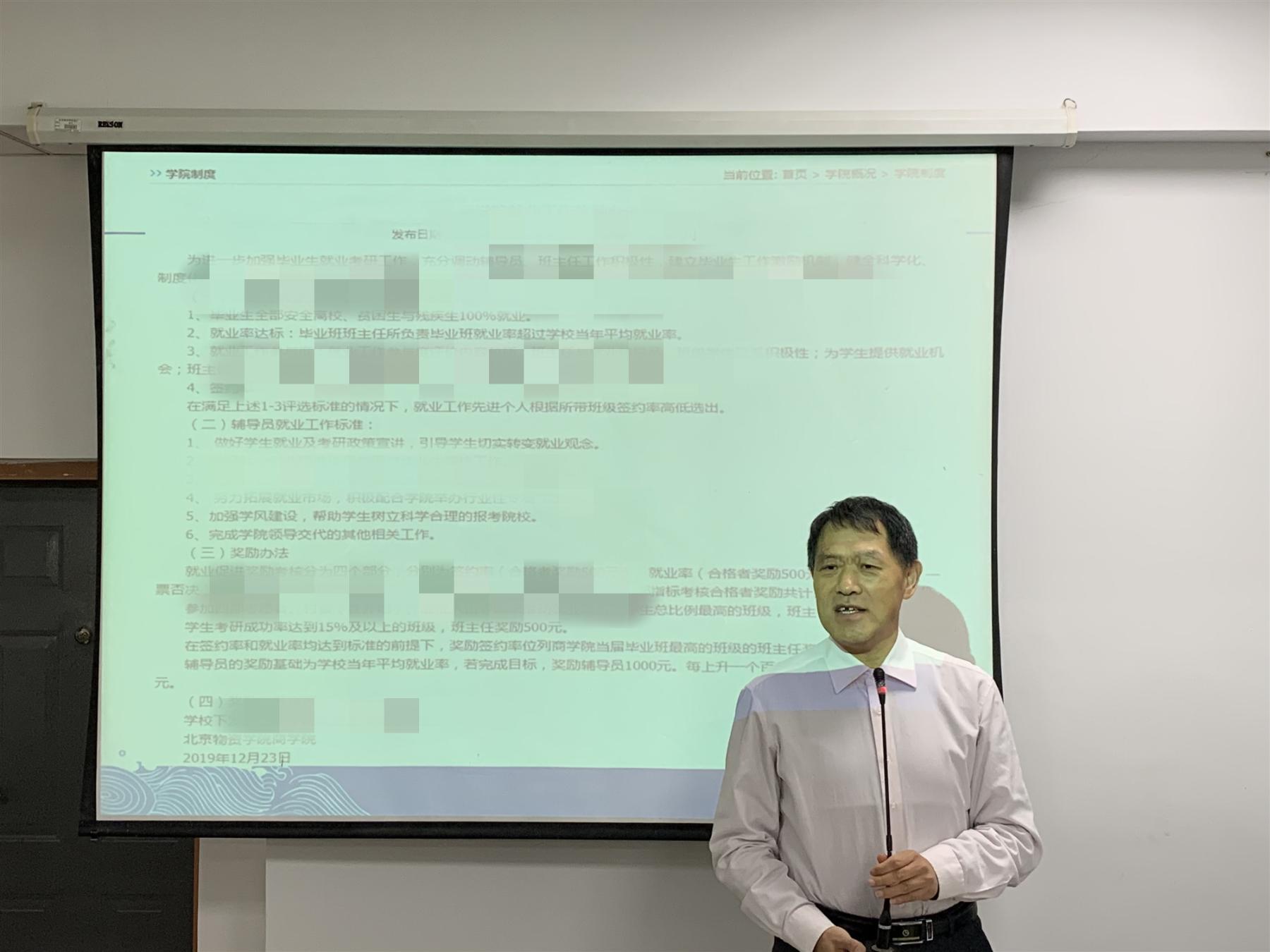 党委副书记陈霄英介绍了学院就业工作奖励办法,并对毕业年级班主任和毕业年级导师应做的工作进行了讲解。陈霄英强调,要及时关注学生学业情况、就业进展和思想动态,帮助解决实际困难,重点掌握“三困一少”学生情况,一对一提供就业指导。
