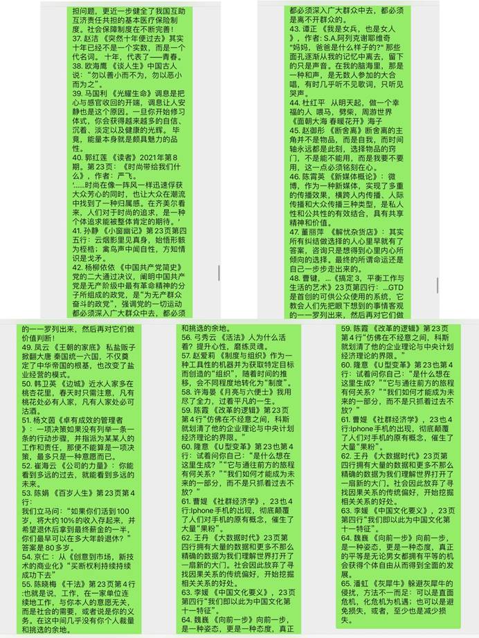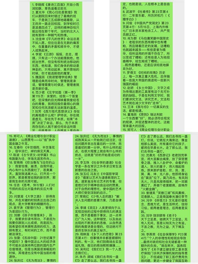 教职工分享最近正在读的一本书中令人印象最为深刻的一句话。活动发起后,得到了老师们的积极响应,在3天时间里共有65位老师分享了自己的读书内容。老师们分享的读书内容,既有中国共产党的峥嵘岁月,也有诗词歌赋的浅唱低吟;既有专业著作的点睛之笔,也有文人墨客的洛阳纸贵。大家在书籍的海洋中徜徉,在各种不同类型、不同内容、不同风格的读书文字中,缅怀革命先烈的英雄不朽,回忆青春芳华的壮丽不挠,钻研专业知识的精深博大,体味世间人情的冷暖变幻。
