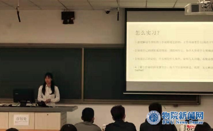 第一位上台的是扎根于就业实践的周凤玲,她着重讲述了如何撰写、投递简历,如何选择公司等问题,她建议同学们在投递简历前应当充分了解目标公司的相关信息,衡量公司带给自己的成长机会,有的放矢才会有所收获。