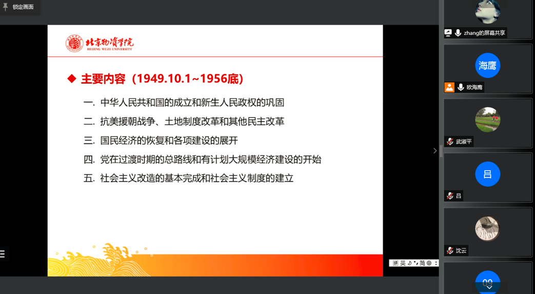 本次党课的主讲人张玉红选取《中国共产党简史》一书中的第五章“中华人民共和国的成立和社会主义制度的建立”作为学习主题,主要为全体支部党员梳理讲解了从中华人民共和国的成立到社会主义制度的建立,时间从1949年10月1日到1956年底之间,中国共产党领导全国人民建立和巩固人民民主政权,进行社会主义改造过渡时期的一段历史。主要内容包括五个方面:中华人民共和国的成立和新生人民政权的巩固、抗美援朝战争、土地制度改革和其他民主改革、国民经济的恢复和各项建设的展开、党在过渡时期的总路线和有计划大规模经济建设的开始、社会主义改造的基本完成和社会主义制度的建立。