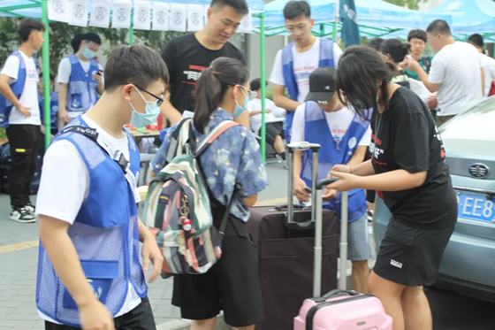 为加快新生入校进度,减少人员聚集,学校采用新生先入校报到,行李由学校专车送往行李寄存处,等新生报到完成后,在志愿者的引导下,领取行李,返回宿舍。宿舍楼下的耐心等待,篮球场楼梯口的上下搬运,校门口和宿舍的来回往返,志愿者们始终带着亲切的微笑,认真负责地为新生引路。为了缓解搬运行李带来的疲惫,我们还特意准备了党史问答活动,为新生送上一份入校小礼品。