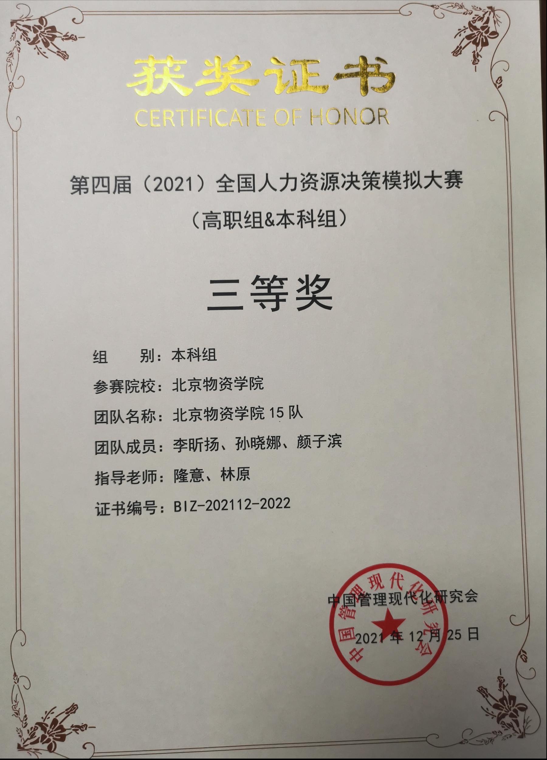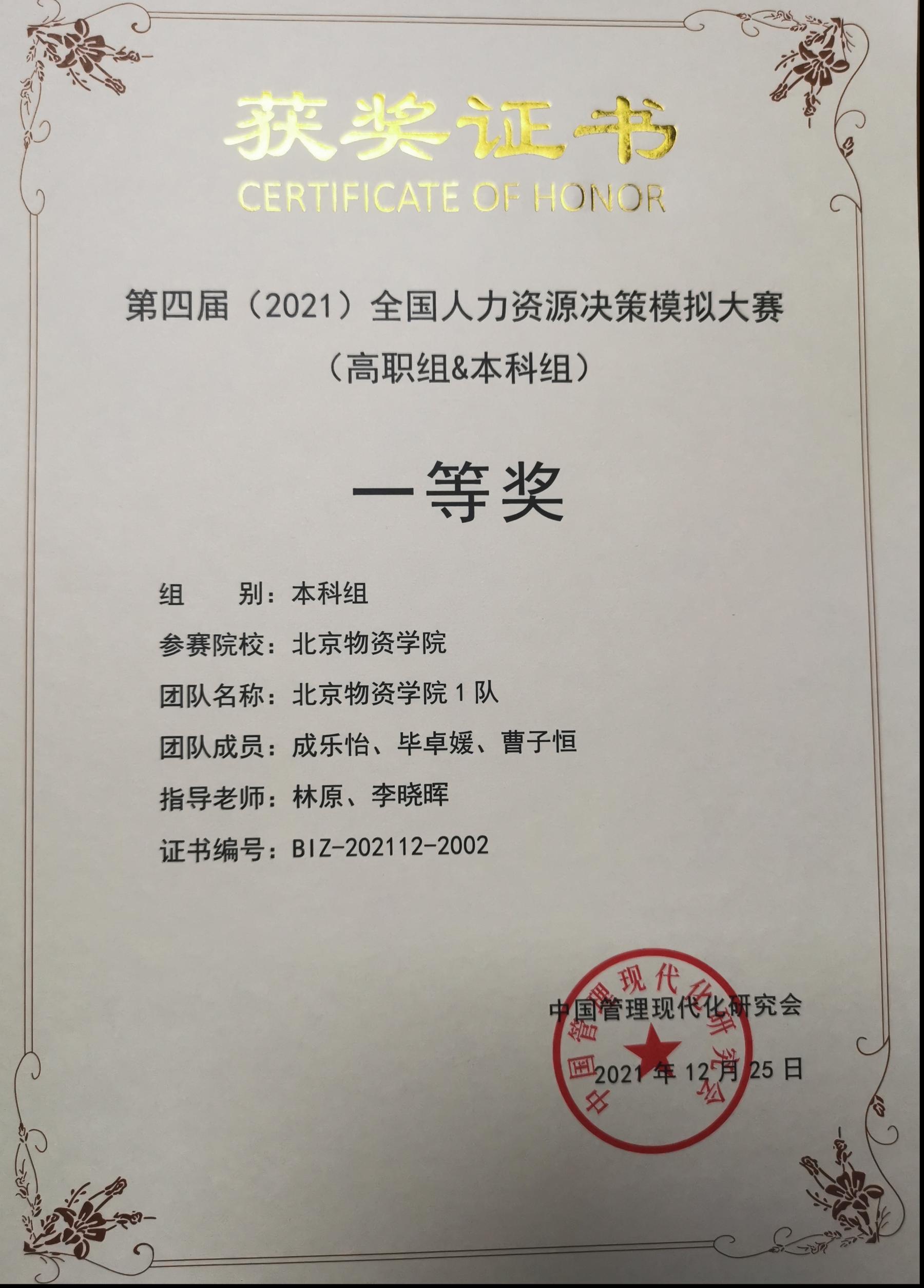 在第四届(2021)全国人力资源决策模拟大赛中获佳绩