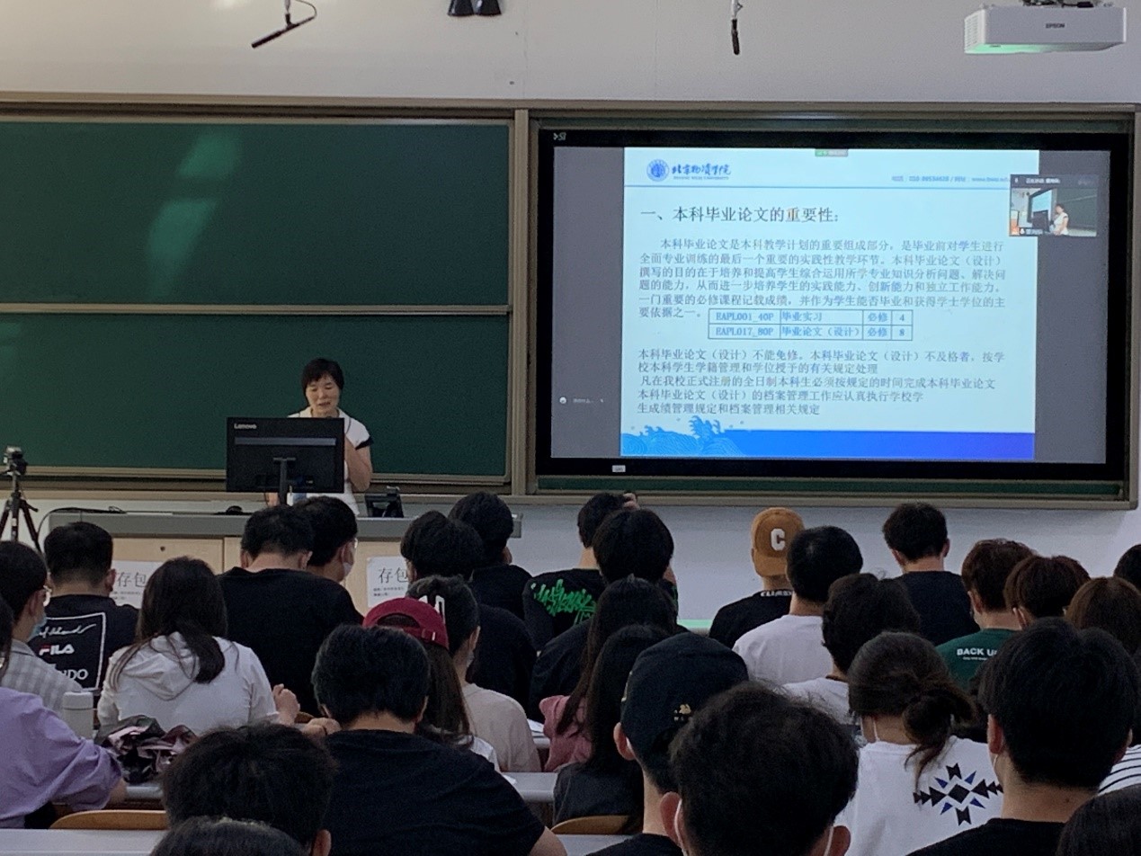 各专业特点详细介绍了毕业年级撰写毕业论文的关键环节和要点,根据时间脉络梳理了论文选题、开题报告、中期检查和论文答辩等环节的要求和注意事项;同时,李老师还强调了毕业实习环节是本科必修的实践性教学环节,并结合2019级培养计划就学生毕业实习的实习日志和实习报告要求进行了分析介绍。