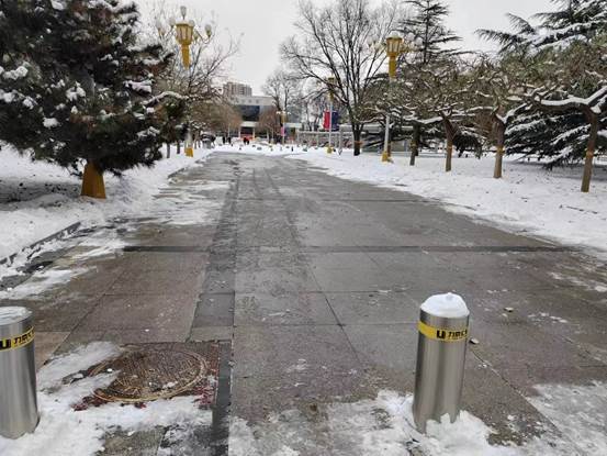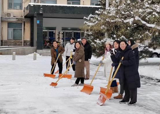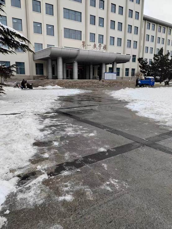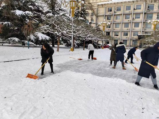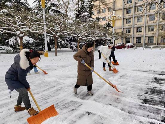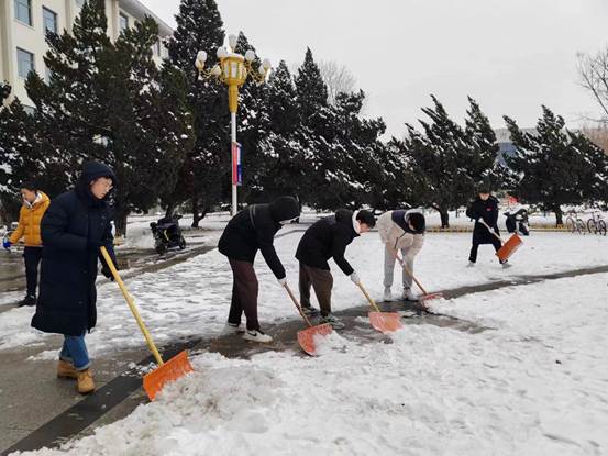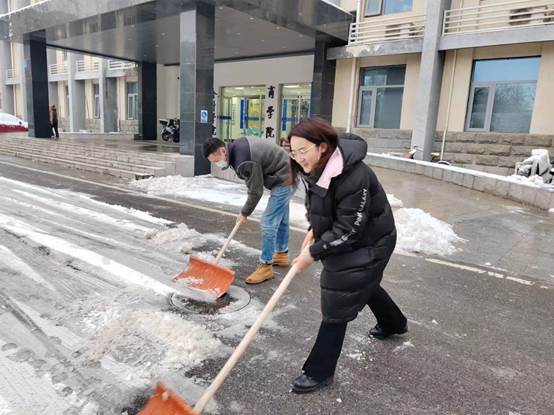 党委书记常娥、院长吕波第一时间带头组织党员师生开展铲冰扫雪;广大干部和教职工坚守岗位,落实工作责任;学工队伍密切关注同学们状况,做好预警,及时回应关切问题。