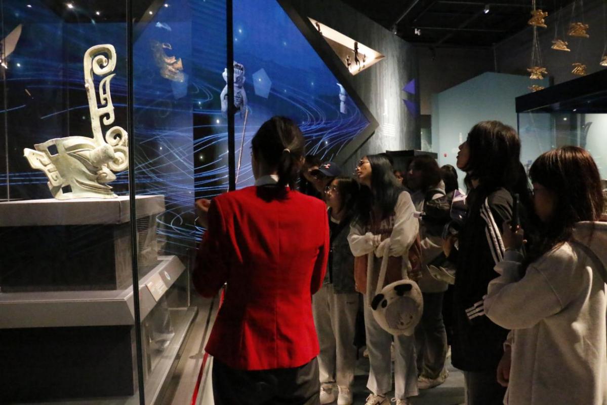 学子跟随讲解员的脚步,参观大运河博物馆三星堆展区,学生认真聆听讲解,深入剖析“古蜀文化”的独魅力和艺术成就,感受古蜀人的智慧和创造力。