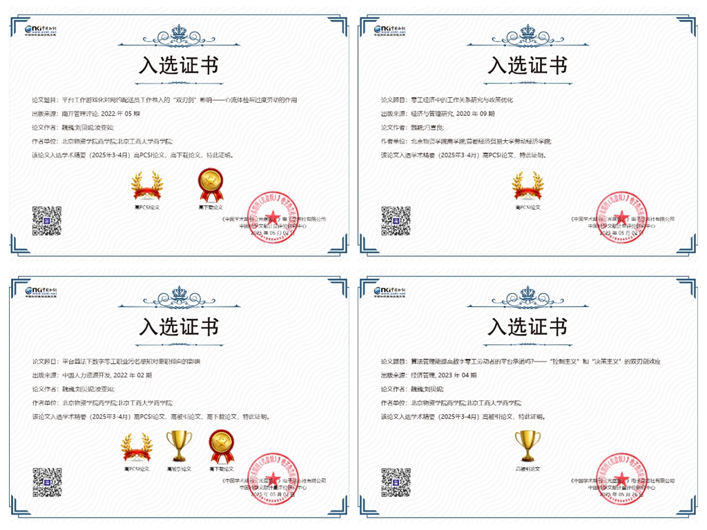 魏巍教授与已毕业研究生合著论文《平台工作游戏化对网约配送员工作卷入的“双刃剑”影响——心流体验与过度劳动的作用》入选中国知网《学术精要数据库》(2025年3-4月)高PCSI论文、高下载论文。此前,该论文在2023年2月国内最受读者喜爱OB&HRM论文排行榜位列第一名。该文原载于《南开管理评论》2022年第5期。(截至2025年5月26日,知网总被引量76次,总下载量10742次)