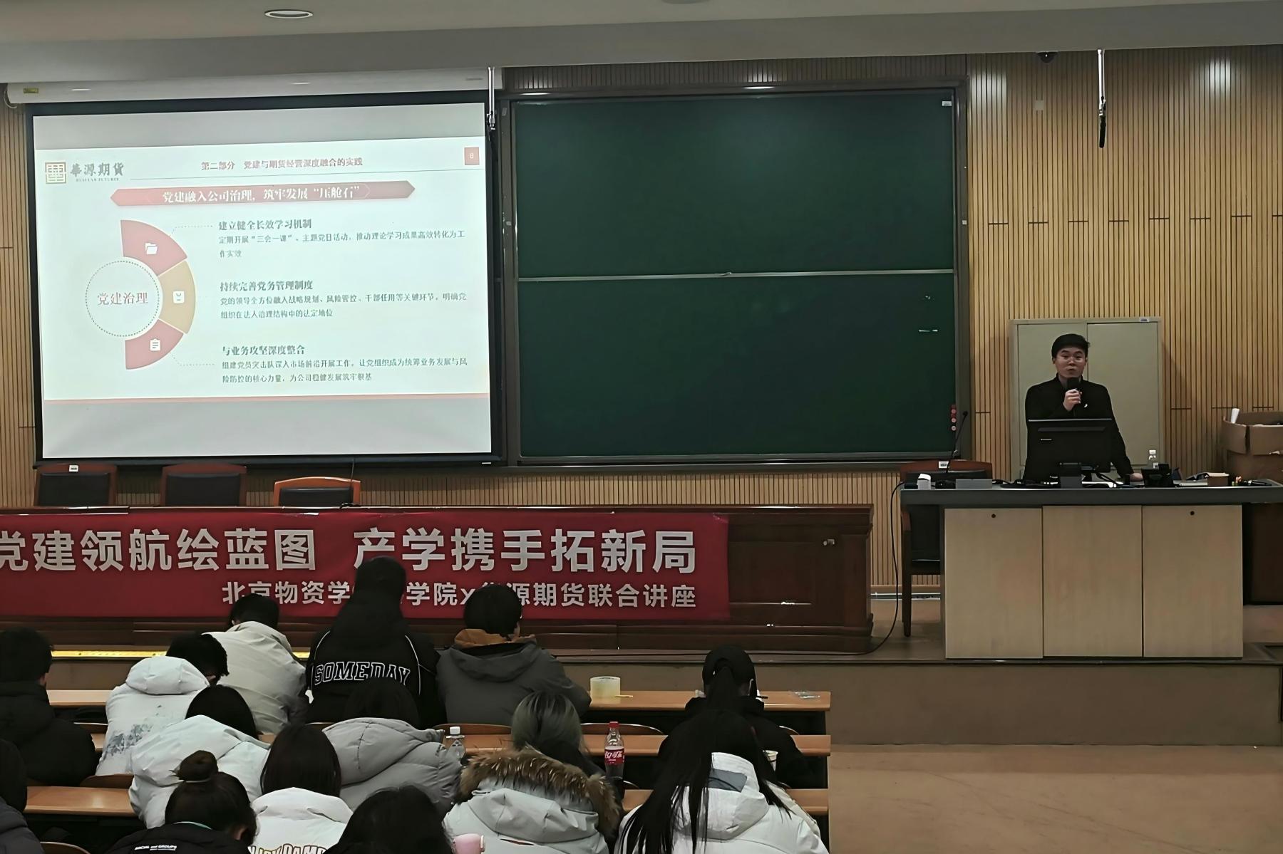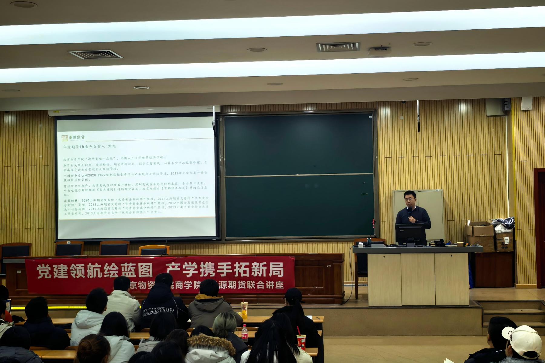 随后,华源期货IB业务负责人、物资学院2006届校友刘旭以“当前经济形势下的商科毕业生职业发展”为题进行分享。结合二十年期货行业从业经验,他分析了经济增长模式转变、生产要素演变与新形势下的人才需求,指出商科学生应主动构建“商科+X”复合知识体系,关注国家战略导向,增强解决复杂实际问题的能力。刘旭还以自身参与国家级贵金属风险管理项目为例,阐述了期货行业在服务实体经济、防范金融风险中的重要作用。