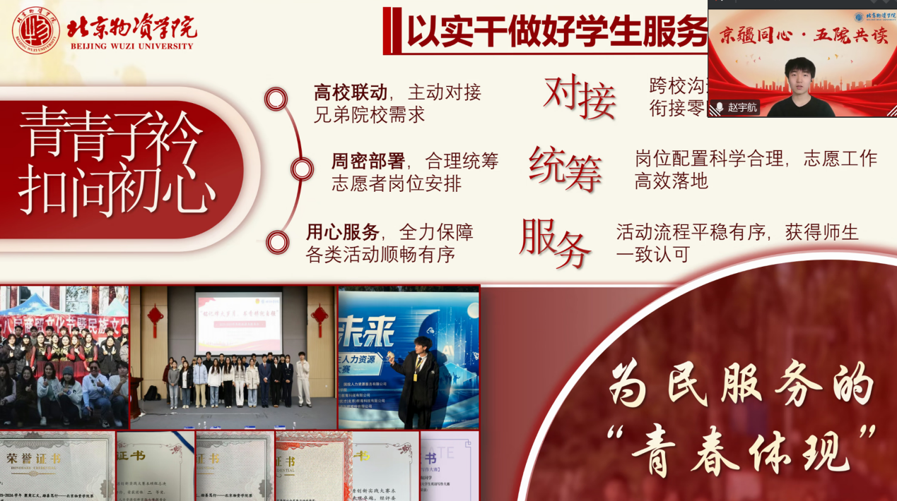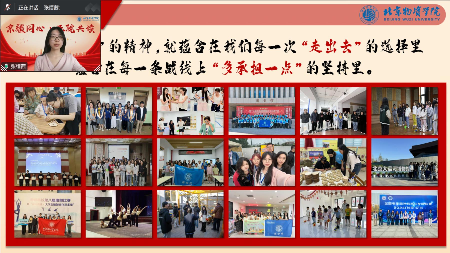 辅导员王雅琪向参与活动的全体京疆师生简要介绍两位同学的学习实践经历与分享主题,传递学院对青年学子深耕阅读、提升思想素养的殷切期望。两位学生代表张缙茜、赵宇航依次结合自身学习感悟、实践经历,围绕选定的读书主题展开精彩分享。同学们立足青年视角,将理论学习与青春实践相结合,畅谈读书心得、分享思想收获,展现出商科学子勤学善思、笃行不怠的精神风貌,也在交流中传递了正确的价值理念与青春担当,赢得了线上各院系师生的一致认可。
