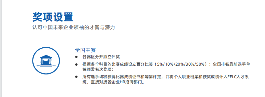 其他收获:通过参加FELC全国高校商科学术竞赛能够帮助同学扎实提升个人商科专业知识水平和求职竞争力。FELC根据比赛成绩为获奖同学颁发奖项和官方证书,同时竞赛成绩和简历录入FELC官方数据库,直通企业HR优先获得实习机会。