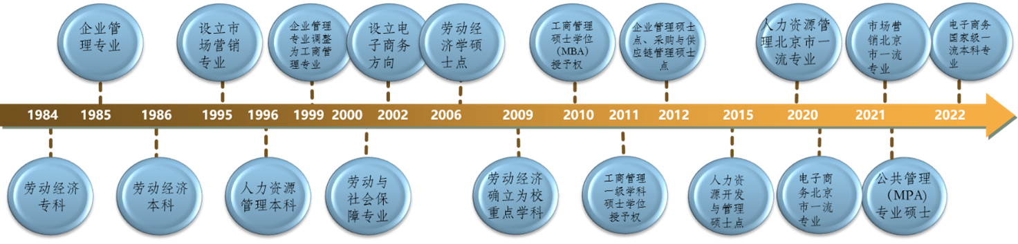 是学校独具商科特色的二级学院,专业建设历史悠久。学院现有工商管理、工商管理(精英实验班)、市场营销(数字化营销)、人力资源管理、人力资源管理(国际人力资源管理)、劳动与社会保障等6个本科专业及方向,拥有工商管理一级学科硕士学位点、工商管理硕士(MBA)学位点、公共管理硕士(MPA)学位点和企业管理二级学科以及供应链管理、人力资源开发与管理2个目录外二级学科。其中,人力资源管理专业、市场营销专业是北京市一流本科专业建设点,工商管理学科在教育部第四轮学科评估中获C+成绩。