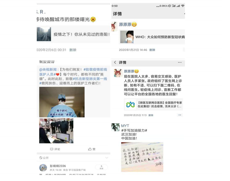 自武汉疫情发生以来,除了线上捐款、村头防控、在家运动、学习以外,每位党员都在为疫情全力以赴,尽可能贡献自己的力量,利用微信朋友圈、微博为武汉助力,并宣传新冠病毒的防御知识。无论我们身在何方,我们都心系武汉、心系湖北。
