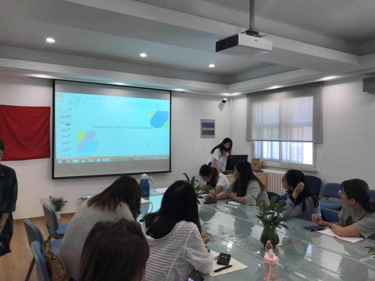 本次会议主题有三部分内容。第一部分由大四党员李蒙同志为大家讲解。主要内容为学校2019年全面从严治党工作会精神。王文举校长指出校党委会继续坚持稳中求进的工作总基调,并对做好2019年全面从严治党工作提出了具体要求。