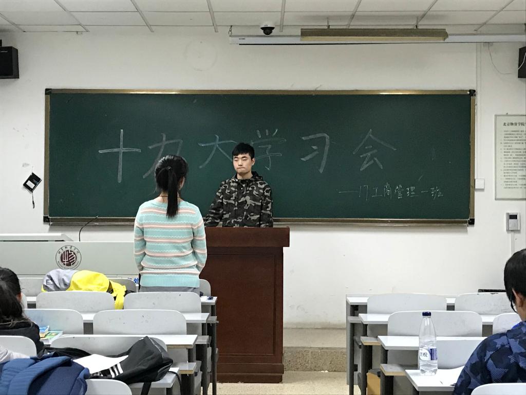 各班秩序井然,学习氛围十分浓厚,各班班导都及早来到班内安排工作。会议开始,班长以问题引入十九大的主题内容,大家表现出很大的兴趣并以相当严肃的态度面对此次会议。会议的主要内容以十九大的“十二个亮点”贯穿,分别是历史的新变革、是时代新开辟,开辟了中国特色社会主义新时代、是矛盾的新内涵、是历史新使命、是实践新路径、是时代新课题、是成果新概括、是理论新飞跃、是实践新方略、是建党新思路、是历史新意义、是表述新界定。会议内容精炼概括,期间同学们毫不吝啬发表自己的想法,有自己独特的见解。最后由班导对此次会议做出总结,为此次会议画上完满的句号。