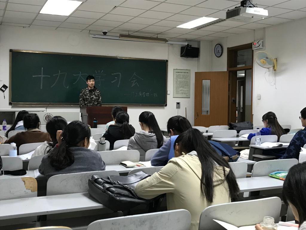 17级新生于11月6日晚自习时间以班级为单位开展了十九大学习会,新生辅导员闫慧凝老师受邀参加。