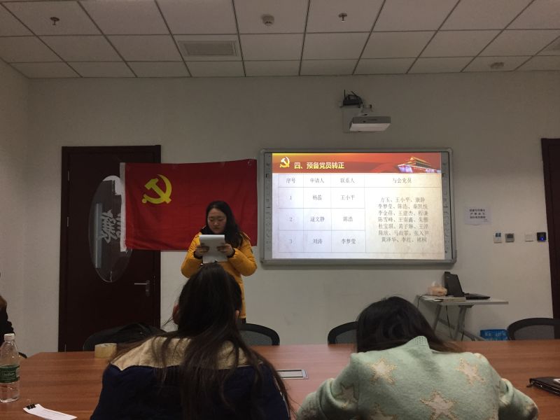 首先由主持人刘涛宣布到场人数以及与会主题。随后,全体起立,面向党旗,奏唱国际歌。紧接着,3名预备党员宣读转正申请书,汇报了自己在预备党员期间的思想以及学习情况。每一名预备党员宣读结束,都由其入党介绍人、与会其他党员对该预备党员是否符合转正条件发表意见。最后,经过正式党员的投票、唱票,三名预备党员一致通过,转为正式党员。