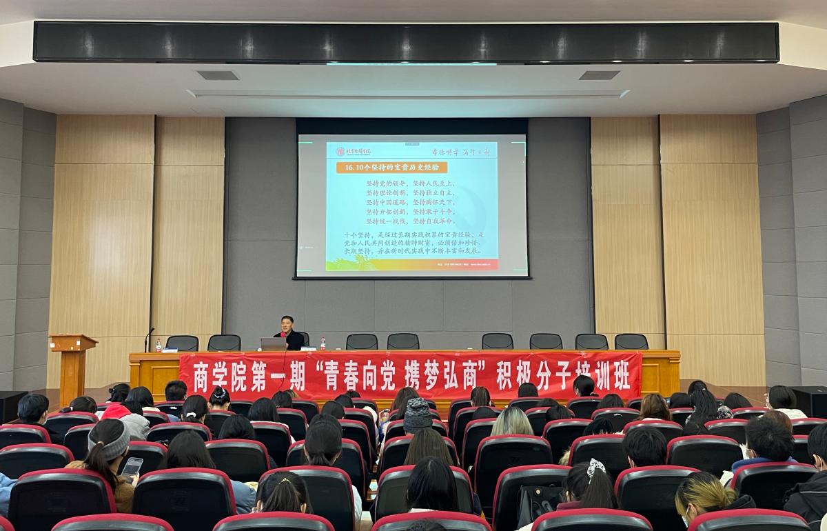 第一期“青春向党 携梦弘商”积极分子培训班于国交二层报告厅开班。本次入党积极分子培训班由党委书记魏国辰教授主讲,92名积极分子佩戴口罩线下参会,80名积极分子于腾讯会议参会。培训班由辅导员杨柳依依主持。