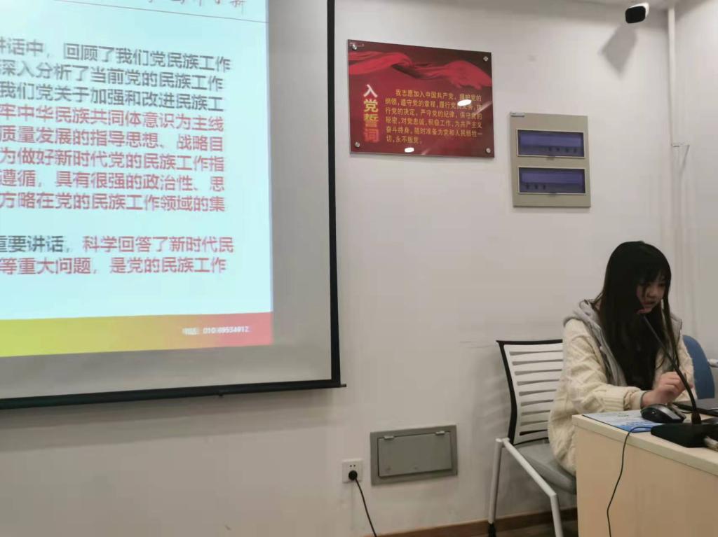 在第一部分,李依璇同学首先介绍了习近平总书记此次讲话的背景,接着她概括并介绍了十二条关于加强和改进民族工作的重要指导思想,强调了中华民族大家庭、中华民族共同体、铸牢中华民族共同体意识等理念。在第二部分,她简要陈述了新时代思政工作的背景、变化和原则后,就“把思想政治工作作为治党治国的重要方式”详细展开,给同学们展示了我国思政工作今后的方向和方针以及深入开展思政教育的方式方法。在习近平主席的重要文章里,从延安到井冈山,从遵义到陕甘宁,同学们在重温历史的同时也忆起了老一辈共产党人的优良作风和顽强不屈的革命精神,红色的革命历史让同学们热血沸腾,经久不息的掌声体现了大家对党感恩和备受激励的心。在最后一部分,李依璇同学总结了习近平总书记八月份在河北承德考察时针对生态文明建设、民族团结、乡村振兴、养老服务等发表重要讲话精神。总结起来为三点——第一,抓生态文明建设,既要靠物质,也要靠精神;第二,要把老有所为同老有所养结合起来;第三,14亿多中国人拧成一股绳。