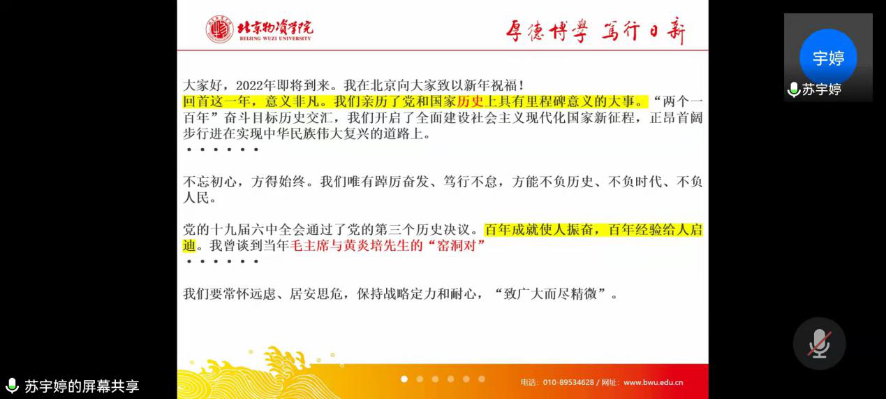 首先由人资学生第一党支部苏宇婷同志对习近平总书记2022年新年贺词进行讲解和分享,从中国目前的历史发展来看,开启了全面建设社会主义现代化国家新征程,正昂首阔步行进在实现中华民族伟大复兴的道路上。解释了作为中国共产党党员我们要“不忘初心,方得始终”,只有这样才能做到“不负历史、不负时代、不负人民”。再到理应受到全国各族人民重视的环保问题,习近平总书记再次强调“绿水青山就是金山银山”的环保理念,最后谈到了北京冬奥会、冬残奥会中国为之付出的努力,为全国人民在新年之际送上祝福。唐坤雅同志表达了全国人民团结一致走向未来的前进信念。