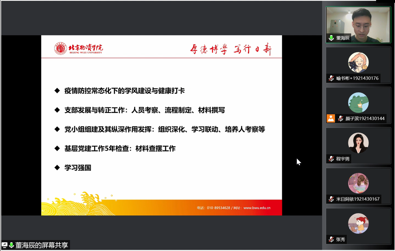 最后,董老师强调2022年人资学生第一党支部的工作重点。第一,疫情防控常态化下的学风建设与健康打卡,为加强校园安全和校园学风建设的基础上,强调党员同志应该起到先锋模范的作用。第二,支部发展与转正工作:人员考察、流程制定、材料撰写;第三,党小组组建及其纵深作用发挥:组织深化、学习联动、培养人考察等;第四,基层党建工作5年检查:材料查摆工作;第五,学习强国上进行理论学习,加强理论基础,提升党性修养。