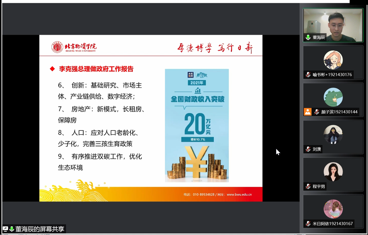 随后,董海辰老师进行关于2022年政府工作报告的学习感悟分享,通过2022年3月5日李克强总理的《政府工作报告》,从宏观经济、财政政策、货币政策、投资、消费、创新、房地产、人口等多个方面进行详细的解释。重点分析了2022年经济社会发展总体要求和政策取向,在过去的几年中积累了应对重大风险挑战的丰富经验,相信在之后的挑战中,中国经济一定能顶住下行压力,必定能行稳致远。