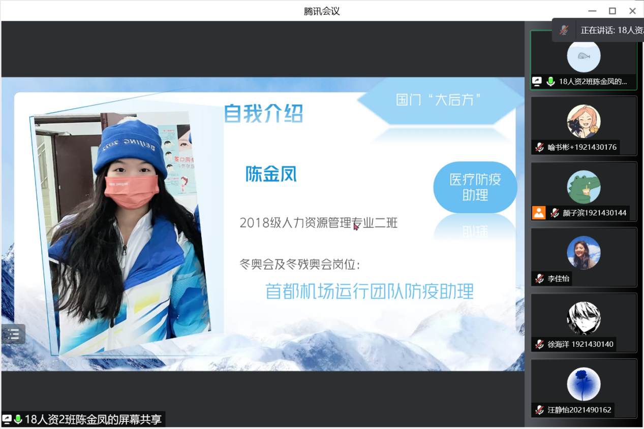 首先,由陈金凤同志分享寒假期间参与冬奥志愿者的经历。从自我介绍、主要工作内容、收获感想三个方面进行。通过首都机场运行团队防疫助理的志愿经历,从主要内容将工作分为每日及每周汇总整理核酸检测结果,通过多体征感知设备进行监测并且反馈异常信息,观测防护服监控,文件攥写与会议准备。陈金凤同志展示了冬奥会及残奥会期间所使用的软件、工作成果等部分内容。