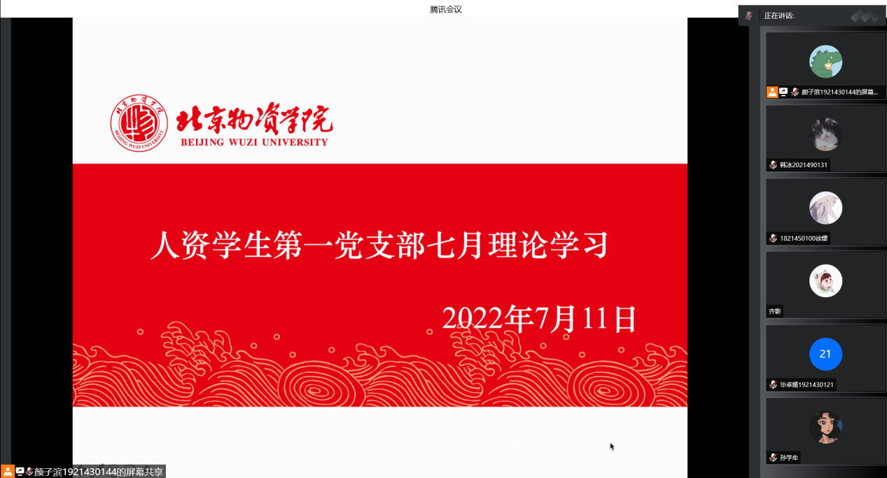 人力资源管理学生第一党支部在线上腾讯会议召开了7月的理论学习会。本次座谈会由人资学生第一党支部书记董海辰老师主持,学生第一党支部全员参与。
