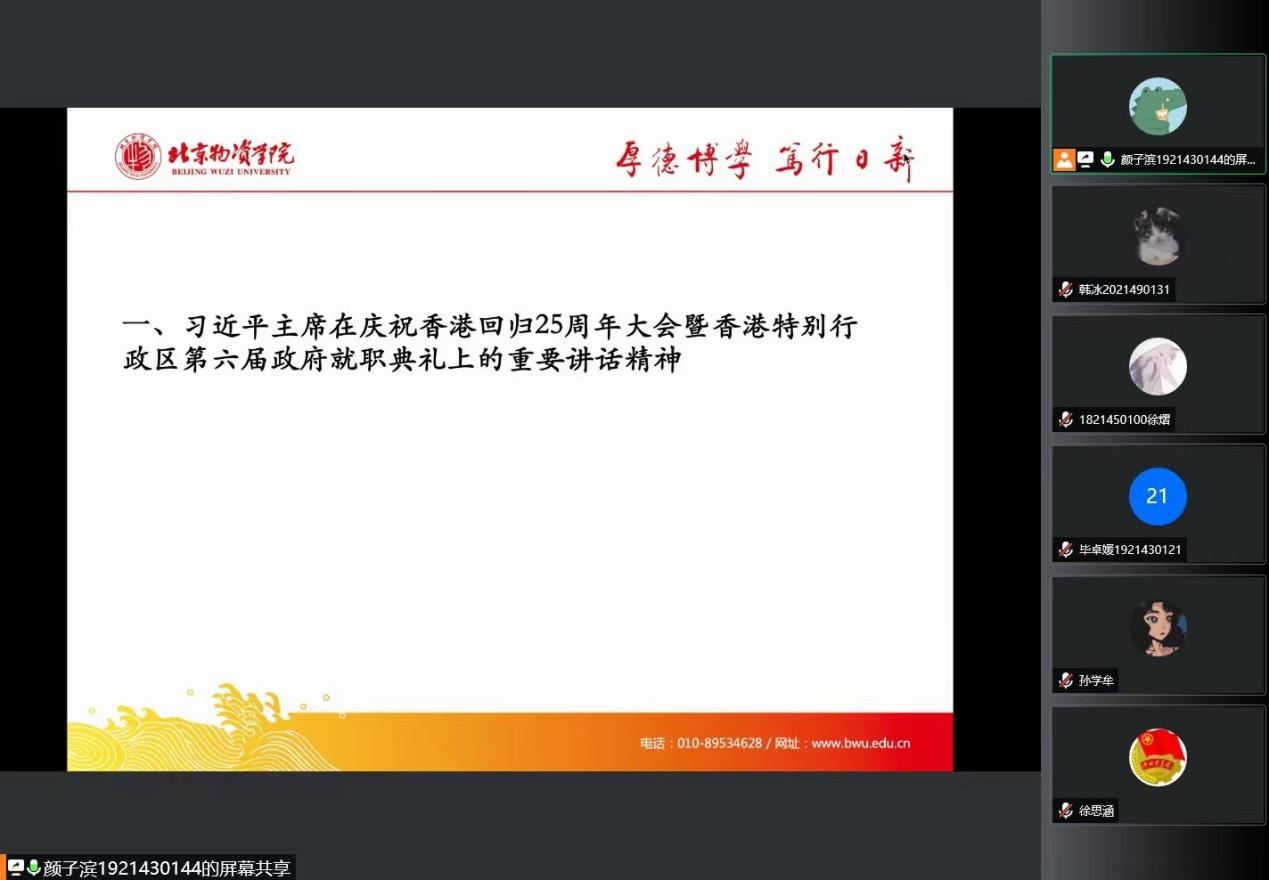 首先由人资学生第一党支部张冰冰同志带领大家学习《习近平主席在庆祝香港回归25周年大会暨香港特别行政区第六届政府就职典礼上的重要讲话》。从中学习到要更加坚定地坚持贯彻“一国两制”的方针,充分发挥好“一国两制”的制度优势,促进香港在新的历史起点再创辉煌!随后董海辰老师通过自身深入阅读学习材料内容为支部同学讲解学习重要讲话精神的的重要性和关键性,并结合自己的经历谈自己的感受,随后同学们积极发言,相互交流,营造了良好的重要讲话精神的学习氛围。
