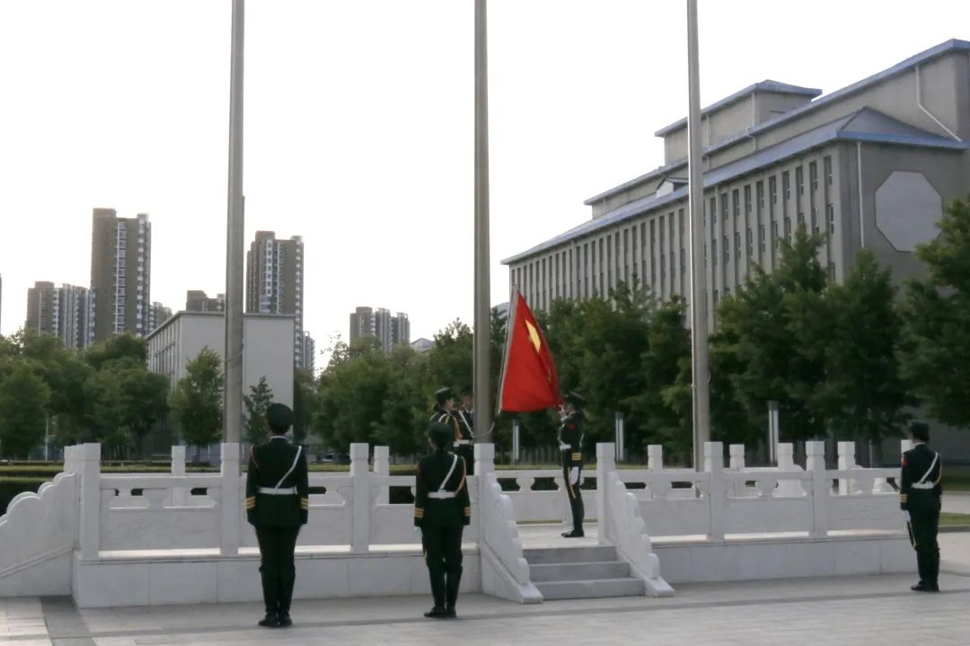 在全体成员的注目下,国旗护卫队气宇轩昂,正视前方,迈着铿锵的步伐护送国旗到达升旗台。《义勇军进行曲》奏起,国旗护卫队擎旗手振臂一挥;国旗冉冉升起,全体成员庄严肃立,向国旗行注目礼,致以崇高的敬意。猎猎红旗在风中飘扬,它讴歌中华民族用血铸就的辉煌历史,彰显神州大地的卓越风采,宣告中华人民不屈的奋斗与拼搏。那抹亮丽的中国红,在参与人员心中跃动,奔涌成青春的信仰洪流。
