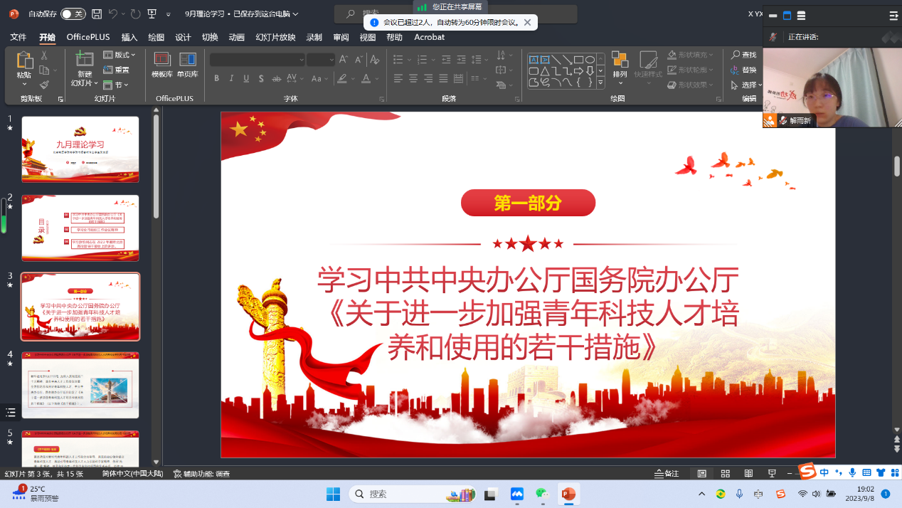 活动伊始,解雨新同志带领支部同志学习了:1.中共中央办公厅国务院办公厅《关于进一步加强青年科技人才培养和使用的若干措施》2.全市组织工作会议精神3.游钧同志在2023年暑期北京高校领导干部会上的讲话。