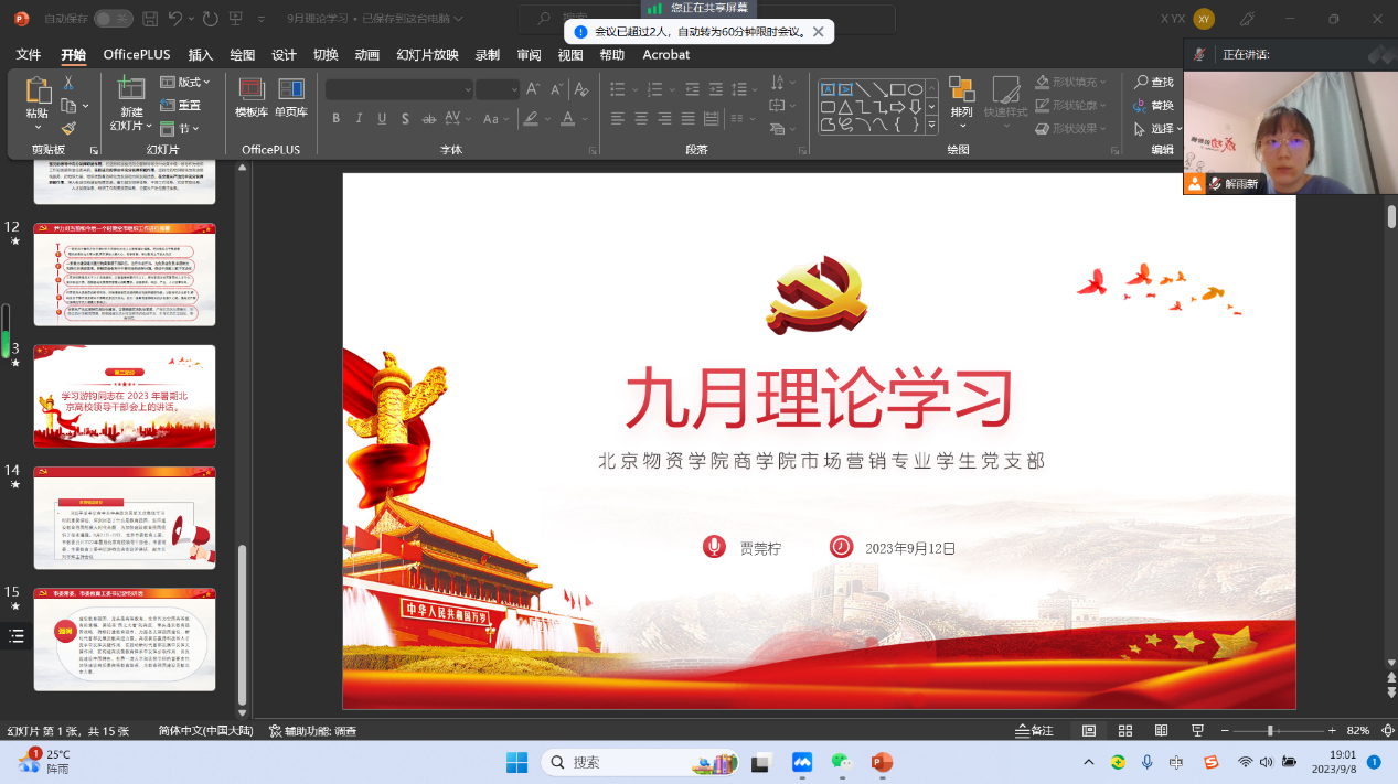 市场营销专业学生党支部第三党小组召开9月政治理论学习会,深入学习中共中央办公厅国务院办公厅《关于进一步加强青年科技人才培养和使用的若干措施》、全市组织工作会议精神、游钧同志在2023年暑期北京高校领导干部会上的讲话。