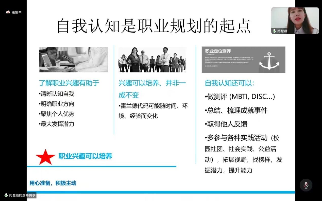 会议通过几个问题开启同学们的思考,同学们积极参与互动,获益颇丰。同时,动员同学们分享、交流职业观念并做出职业规划,帮助同学们更好地确立自己未来发展的方向,更好地建立积极的心态,也能从别人的想法中获得启示,并找到适合自己的路。