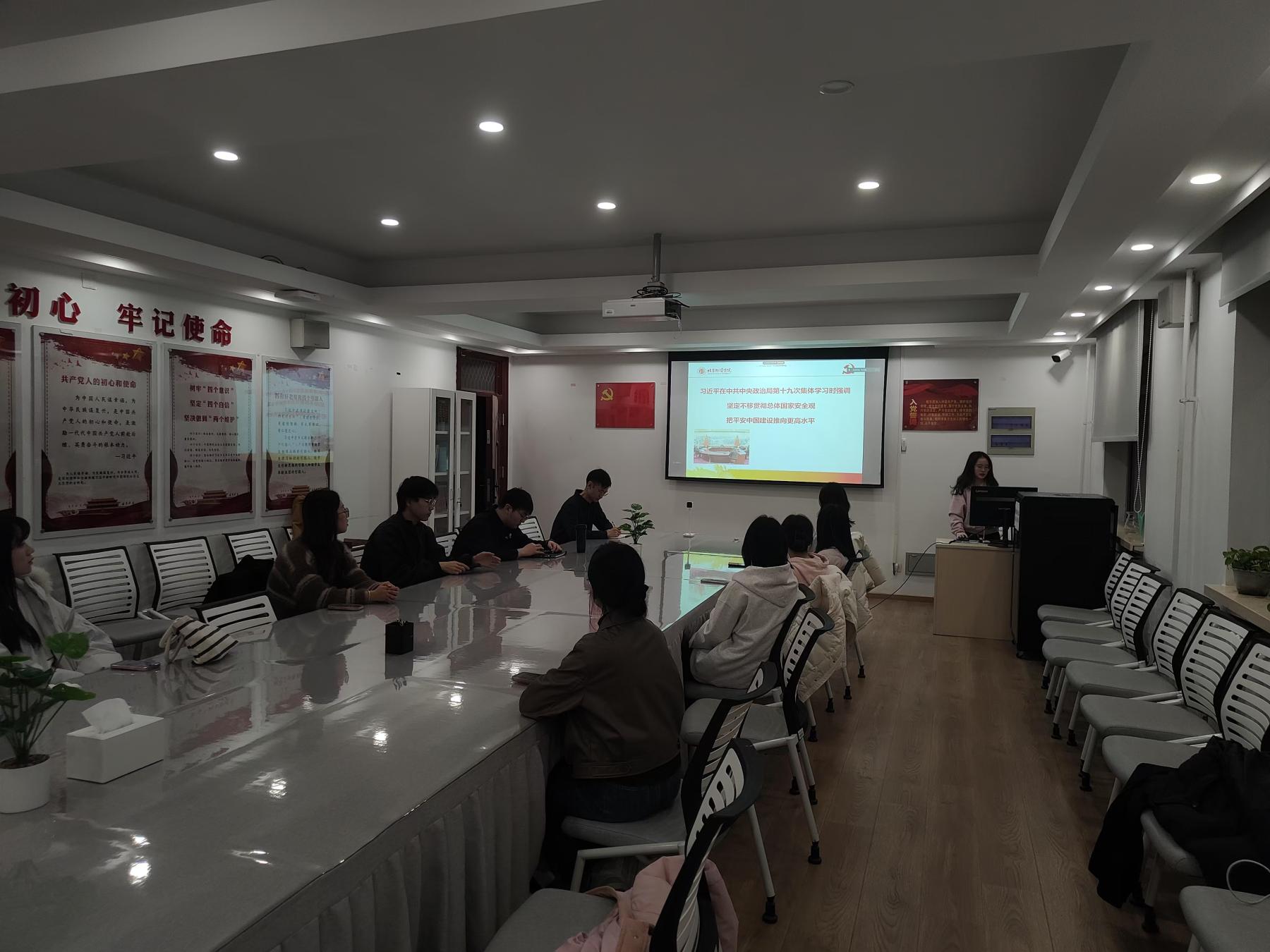 2025年03月10日19:00,党支部组织全体党员在科研楼410召开理论学习会。此次会议由人力资源管理专业学生第一党支部书记董海辰同志主持。本次理论学习会主要围绕学习习近平在中共中央政治局第十九次集体学习强调的坚定不移贯彻总体国家安全观和把平安中国建设推向更高水平的发言内容展开。