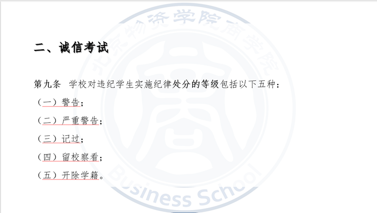 陈昕以学生手册为依据,截取学生手册中关于诚信考试部分进行详细讲解,为全体家庭经济困难学生解读不同违反诚信行为对应的处分等级,同时给学生介绍了目前常见的违纪行为,要求所有学生要杜绝违纪行为,并且要规避会被误认为作弊的行为,要做到不被任何人质疑,始终牢记诚信考试这一基本要求,同时祝愿所有家庭经济困难学生取得优异成绩。