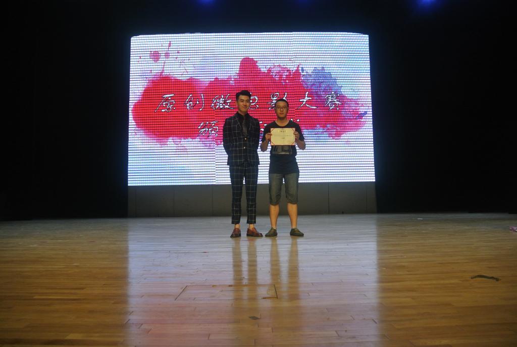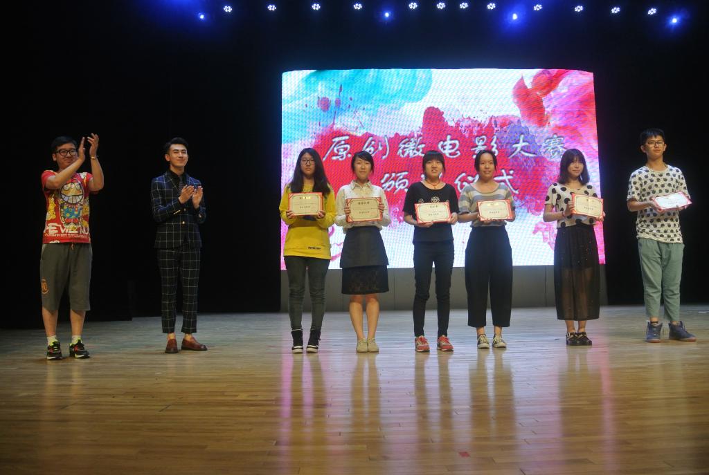 14级工管2班的《陪你到世界终结》获得“最佳拍摄奖”,经济学院的《爱情禁忌法则》获得“最佳编剧奖”,经济学院的《一个像夏天,一个像秋天》获得“最佳配乐奖”,物流学院的《随梦飞翔》获得“最佳演绎奖”,由校团委选送的微电影《我与星星的孩子》荣获本次电影节“最受大学生欢迎奖”。小叮当和郎鹏受邀担任颁奖嘉宾为本次原创微电影大赛的获奖班级颁发荣誉证书并与代表们合影留念。