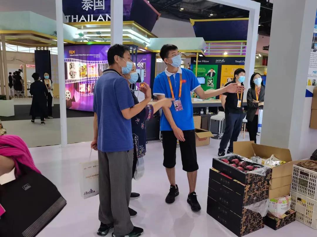 驻守讲解岗的志愿者,以最饱满的精神状态、最亲切的言语,为来宾介绍服贸会内部的展品。