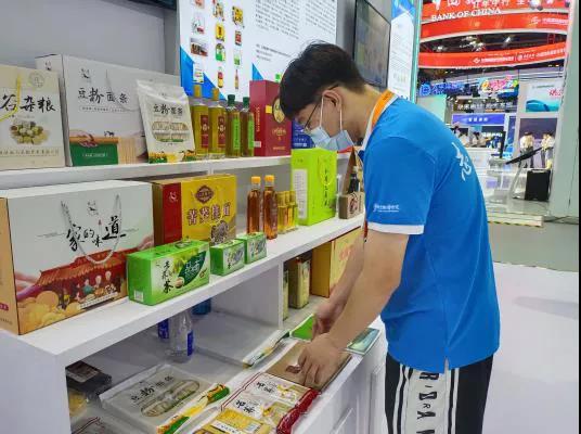 为了协调场内展品,有一些志愿者默默的幕后进行着展品搬运,确保服贸会展区的展品整齐划一、存量充足。