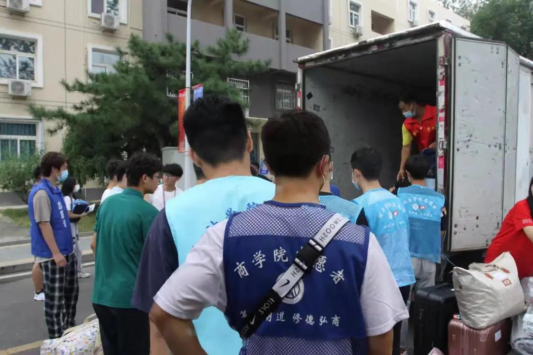 为加快新生入校进度,减少人员聚集,学校采用新生先入校报到,行李由学校专车送往行李寄存处,等新生报到完成后,在志愿者的引导下,领取行李,返回宿舍。