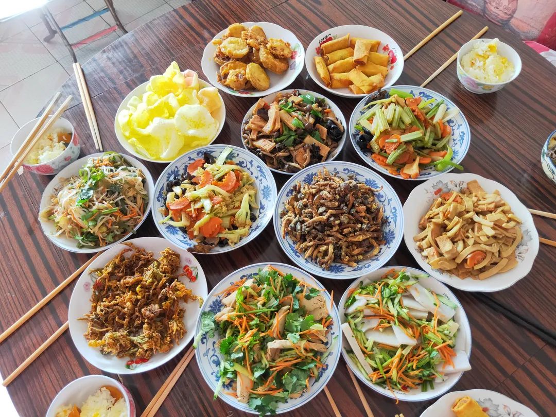 今天是除夕,这些是我的年夜饭,平平无奇的年夜饭,每年的年夜饭都差不多,每年炸的东西是必备的,炸茄盒炸春卷炸虾片炸蘑菇炸黄花菜,u1s1这些炸的我都很少吃因为好腻……再不就是凉菜,也是每年都有,因为姥姥爱吃这个。还有一个木耳炒菜花,emm这个不擦!这个适合我,菜花减肥神器哈哈!还有那个素东坡肉炒竹笋,素东坡肉好吃。一桌子的素菜真是太适合我这个不想发胖的人了hahaha就是miu极了!想到了那个炸春卷,有豆沙馅还有菜馅,我一直都觉得菜馅的春卷真好吃!