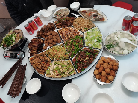 家人团坐,辞旧迎新,年夜饭的菜谱讲究吉祥如意。奶奶,叔叔做的菜可谓色香味俱全。清蒸鲈鱼,芥末虾球,炖鸡,炖排骨,炸丸子,鸡翅中,葱爆羊肉……当然也少不了素菜:炒彩椒,笋丝,地三鲜等。可谓是年年有余、富贵满堂、节节高升、五福临门、凤凰迎春……